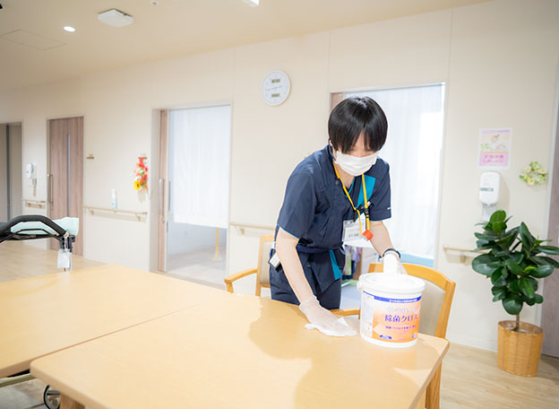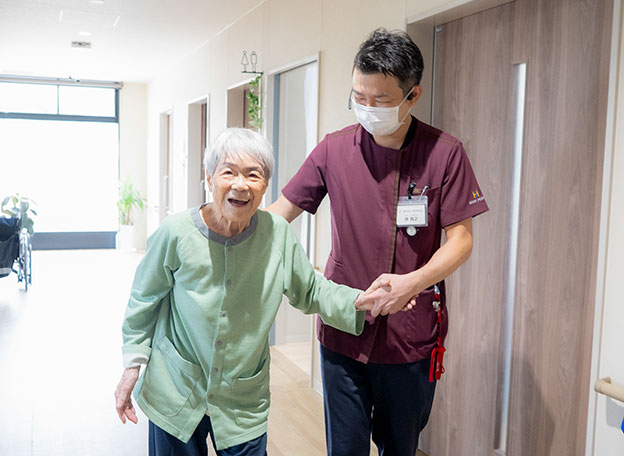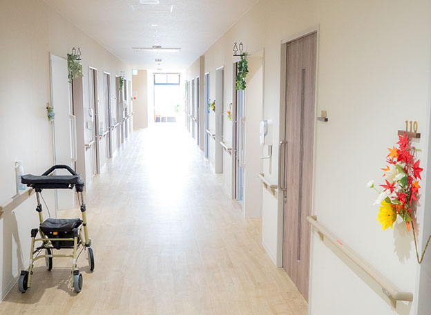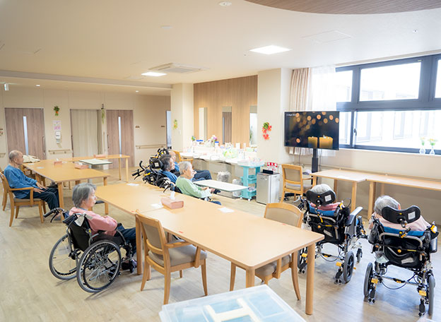 定点で全入居者を見渡せる視認性の高いフロア設計。クッションフロアにより、足腰の疲労・負担を軽減。