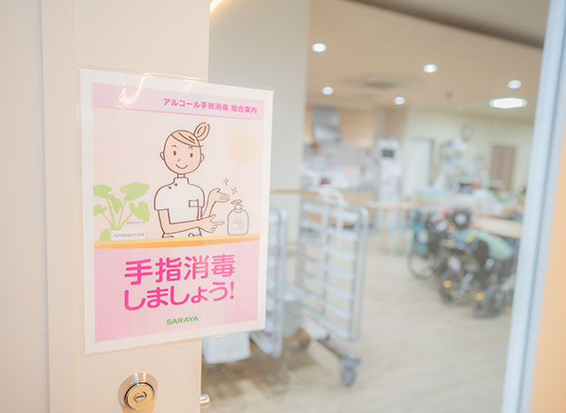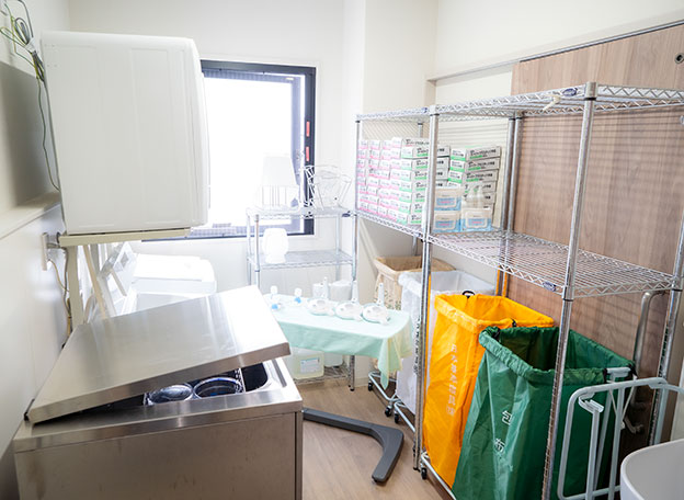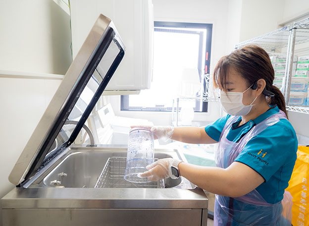 汚物容器等を自動で確実に洗浄・消毒ができる機械を設置。医療関連感染リスクの低減、手作業によるスタッフの負担を軽減。